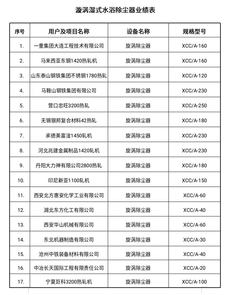 漩涡湿式水浴除尘器部分项目业绩表